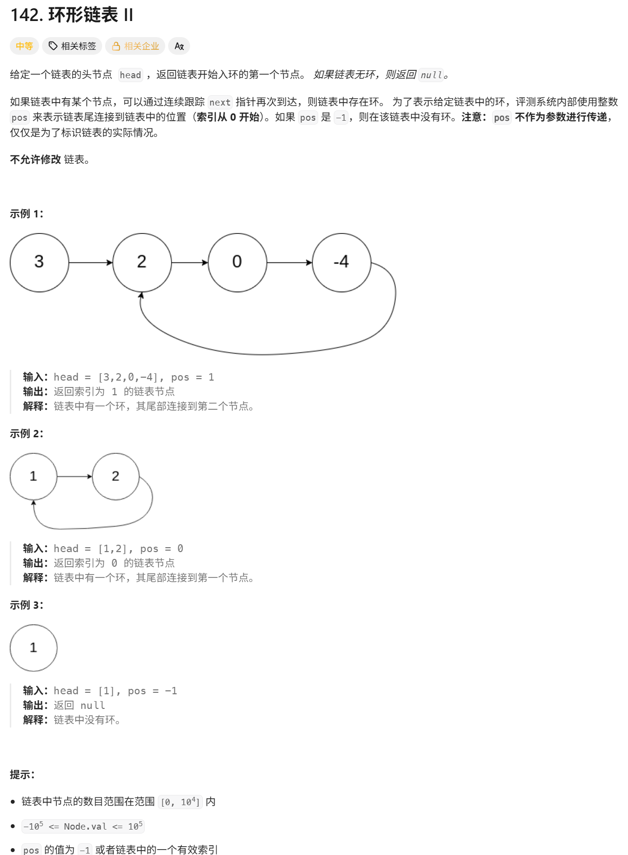 这是题目内容,如果想自己尝试,链接:https://leetcode.cn/problems/linked-list-cycle-ii