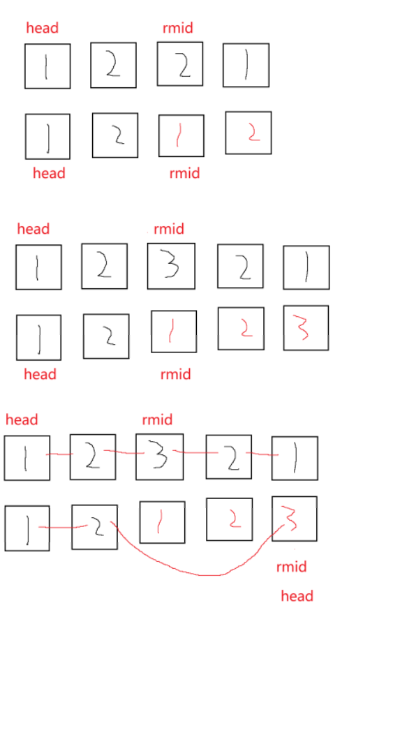 我们先找到链表的之间节点然后再反转后面的链表,最后让指针从链表的头节点和中间节点开始遍历,逐个对比。可能有人会对奇数个节点的情况有疑惑,如下图,可能会想head指针到2后,rmid指针也到2,到后面rmid指针可以指到3节点,那head指针该如何?其实这很简单,我们回归到链表中看,head指针到2节点是里面next指向的还是3节点。