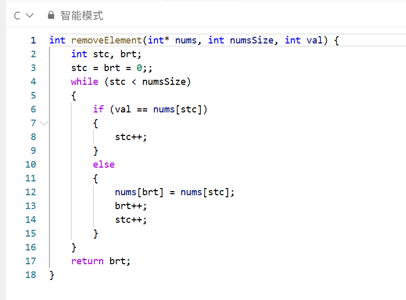 我们拿到这一题会发现它需要我们返回不等于val元素的数量,我们的思路是找两个指针同时指向起始位置,一个指针(str)遍历数组等于val的元素直接跳过,不等于的就赋值给另一个指针(bra),然后bra+1,最后返回bra的值