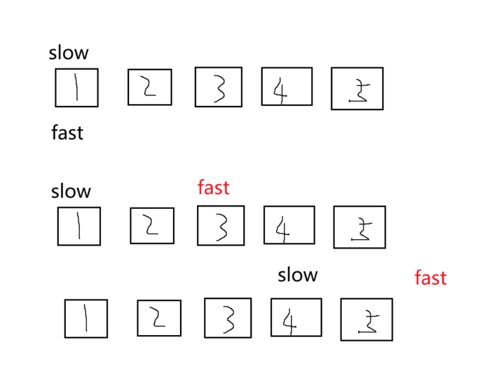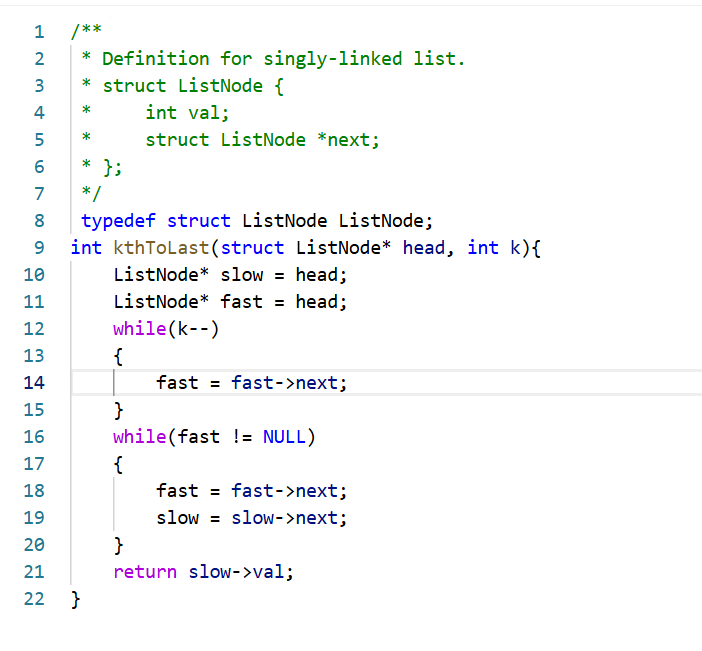 这题拿到我们可能有两种思路,把节点塞进数组解决,但还有第二种是我们前面题目所提到的快慢指针,这次我们让快指针先走k步,再让两个指针同时走,直到快指针走到空。