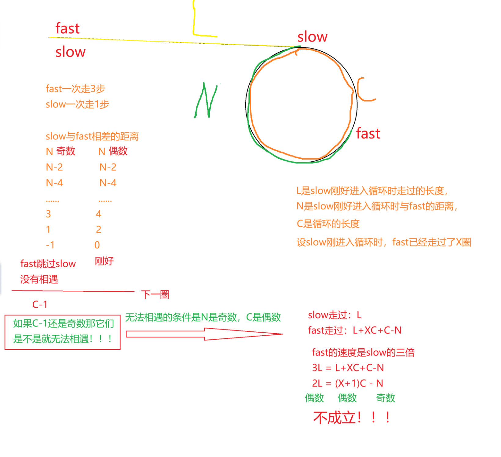 这个问题不难,我们来拓展一下:如果slow走一步,fast走3步,那他们有没有可能不会相遇?