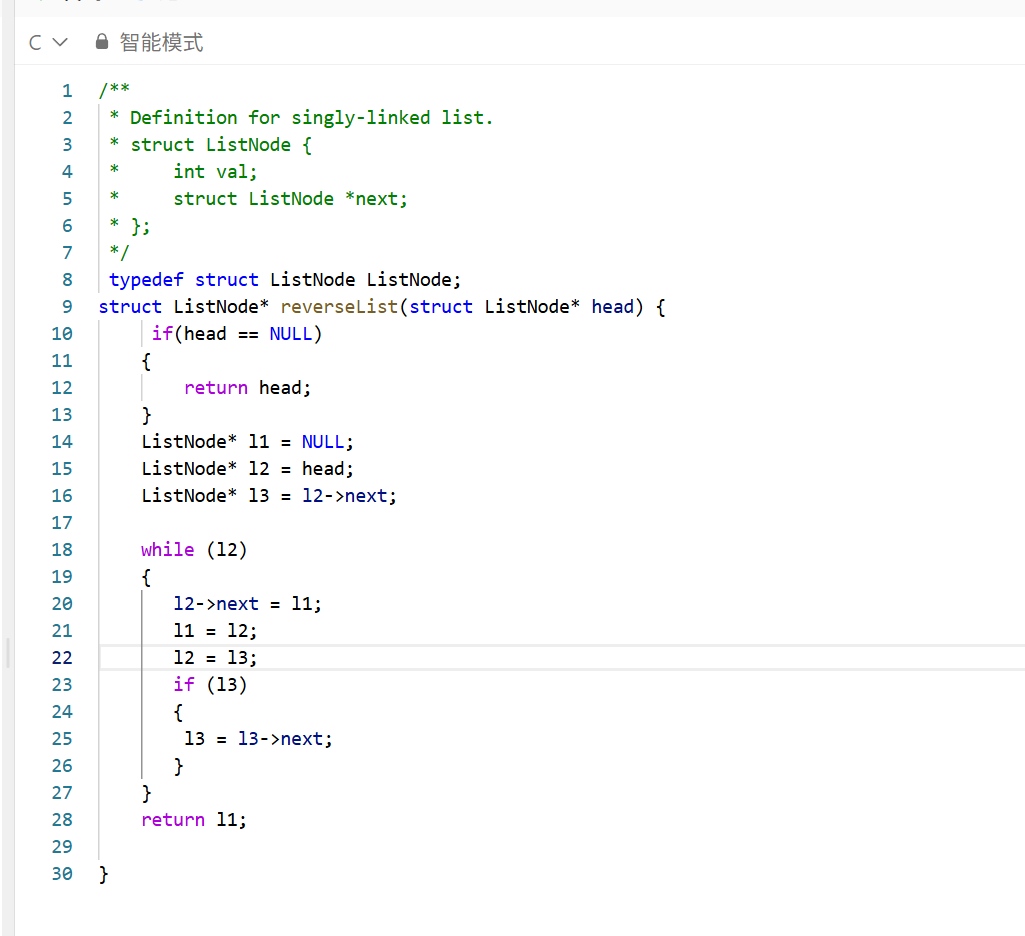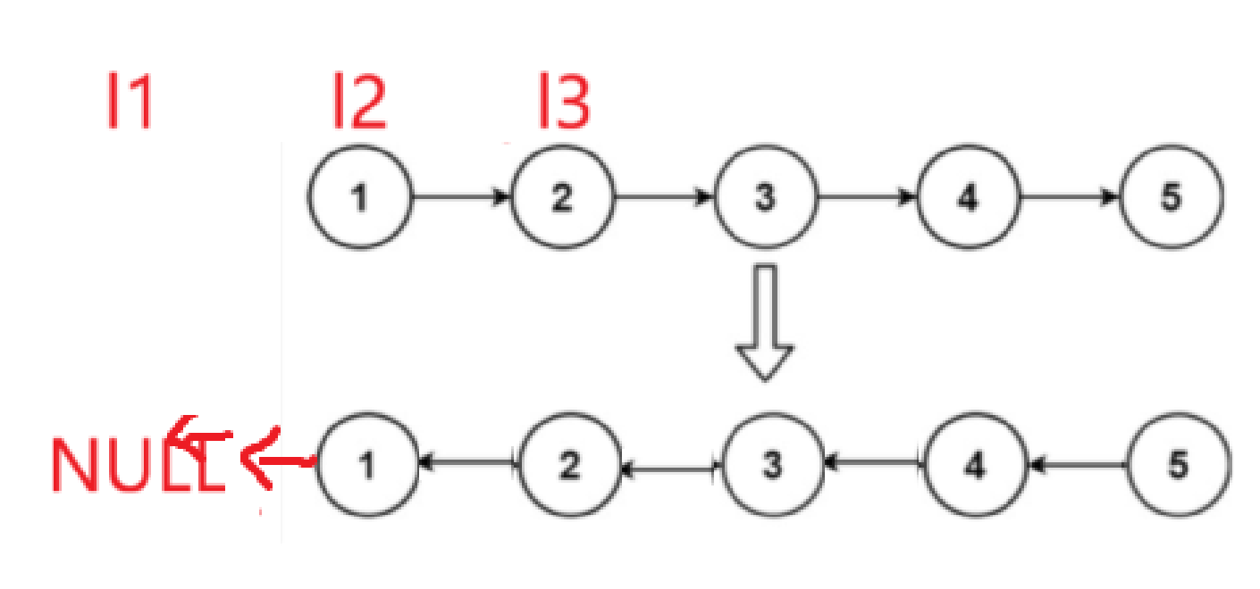 我们需要三个指针来操作,l2->next指向l1,再进行移动l1移动到l2,l2移动到l3,l3移动到l3->next。同时我们还要注意l3进行移动时要判断其是否已经指向NULL,还有链表为空的情况(head=NULL)。