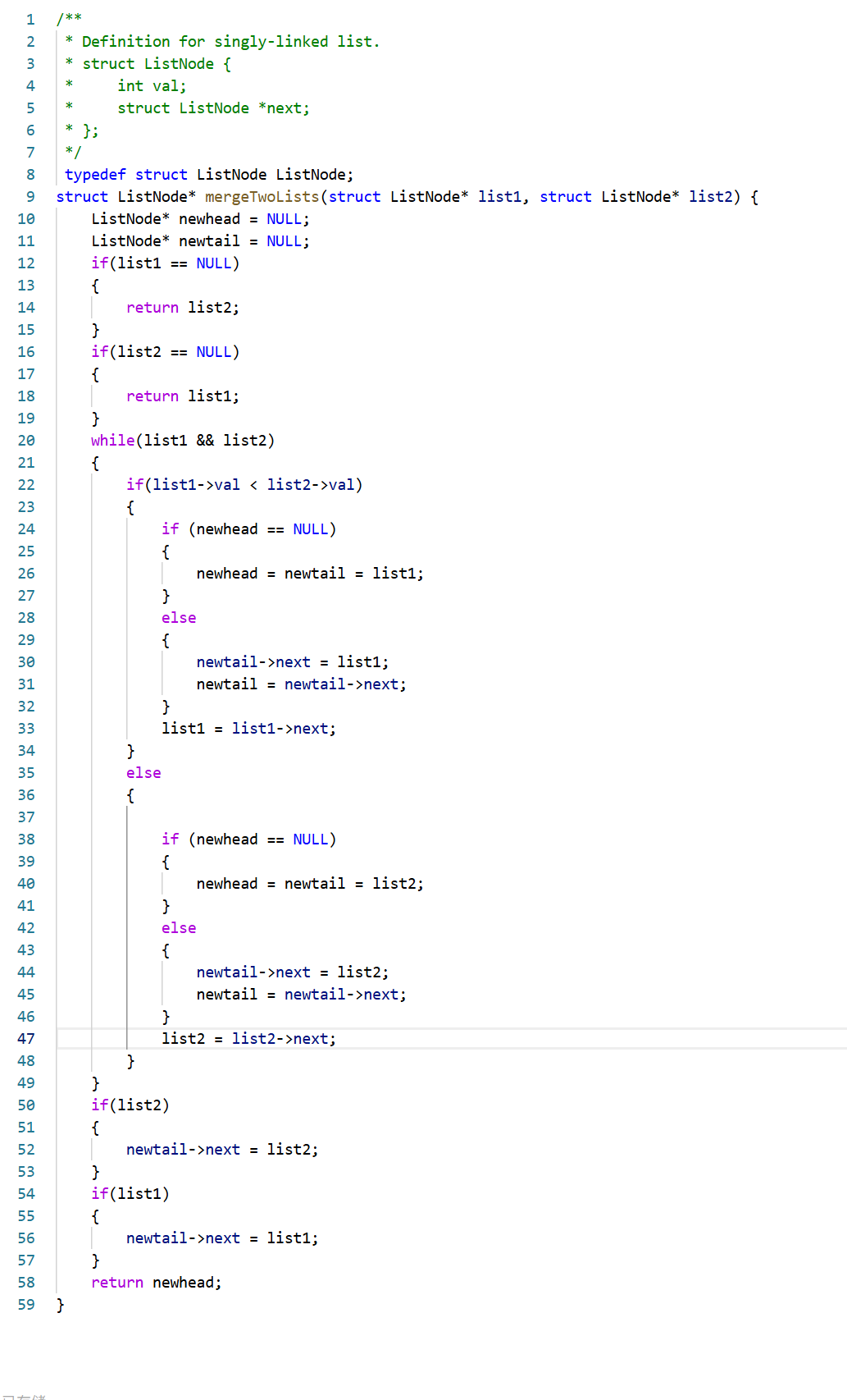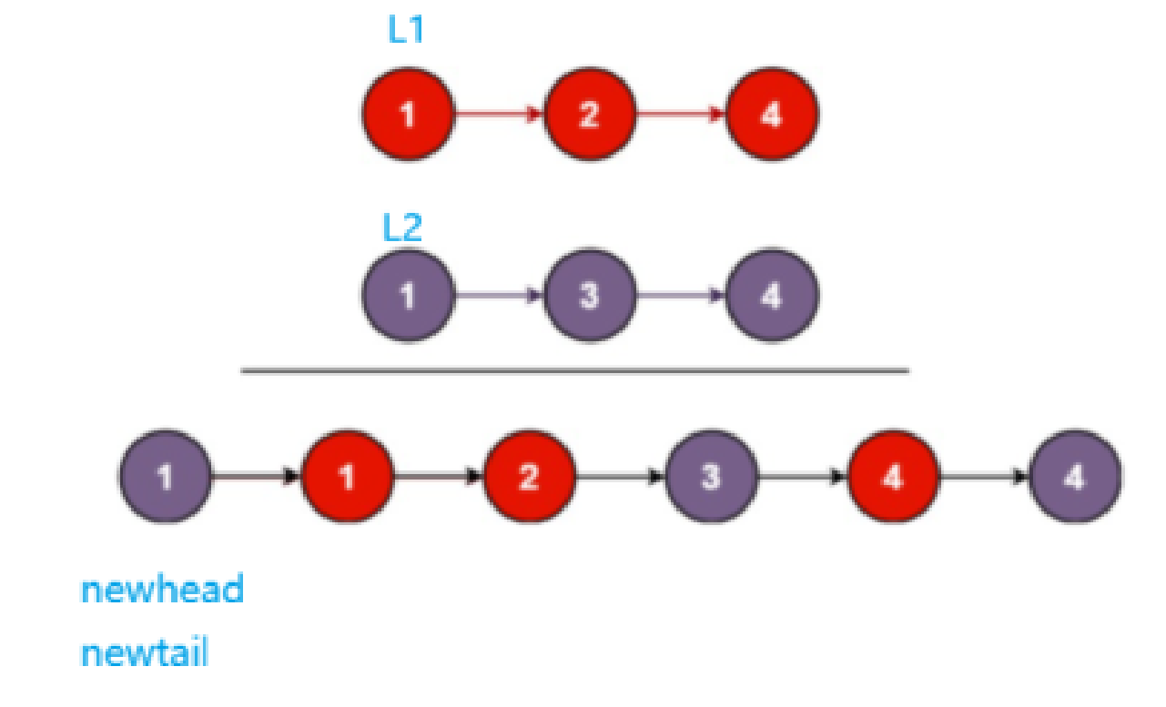 我们在看到这题时会感觉和练习1有些类似。我们的思路是创建一个新的链表,在找两个指针不断遍历两个链表,一边遍历一边比较,要特别注意链表为空的情况和其中一个链表遍历完成了,另一个要加在新链表的后面