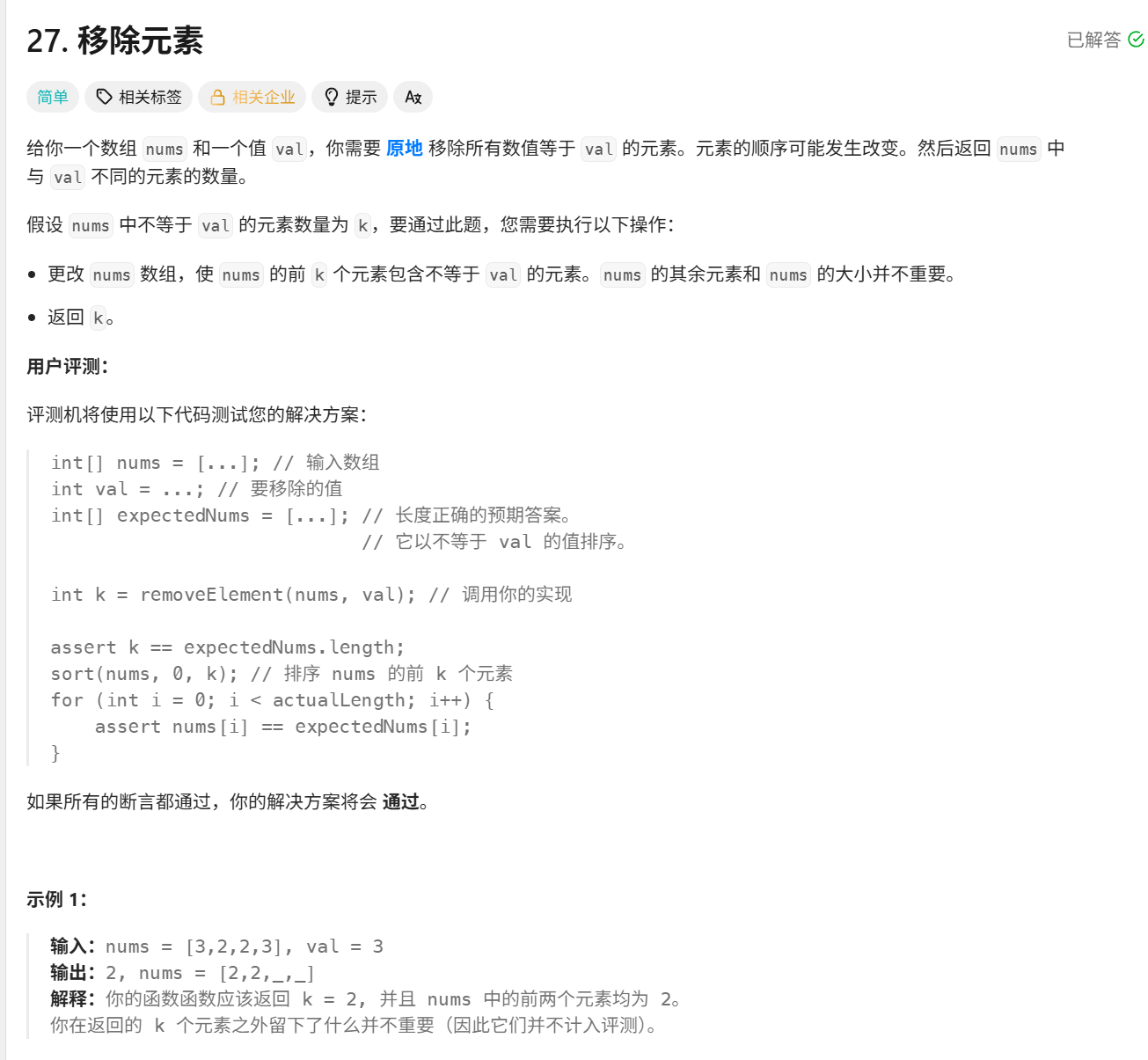 这是题目内容,如果想自己尝试,链接:https://leetcode.cn/problems/remove-element
