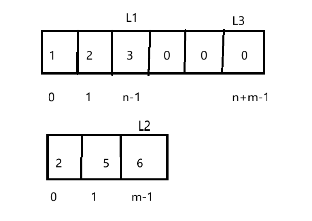 我们还有注意可能遇到的特殊情况,当数组1的有效数字部分都已经插入完(L1已经为0),数组2中的数字不要忘记移到数组1中。