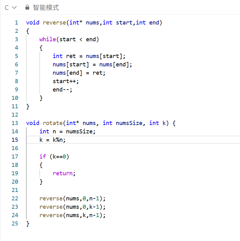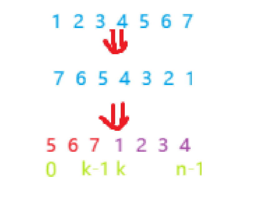 这题的解法有几种,我们可能第一时间会想到冒泡排序中的思路,但这里我们有一种更加巧妙的思路,就是不停转动数组。我们轮转的个数k可能会超过数组的个数n,所以对于实际产生转动效果的应该是n%k,我们先把整个数组反转,在分别反转前(k%n)个元素和其余的元素就达到了我们想要的效果。