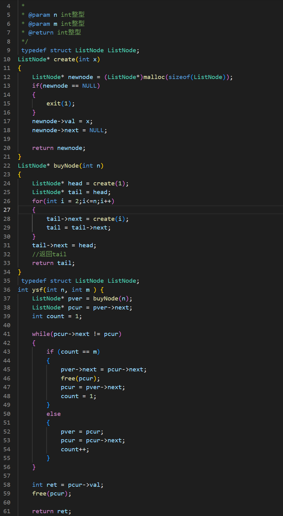 这个题目我们刚看到可能有两种思路,用数组填充n个元素像1,2,3,4……一样,然后利用下标把每个离开的元素置为0,最后找到剩下的元素,但这种思路实现起来相对麻烦。所以我们还有第二种思路就是使用单链表,把n个节点首尾相连成一个环形链表,再通过计数器把计数为m的节点释放。我们要先创建环形链表(先创建一个头节点,再根据n创建剩余节点,最后让首尾相连),再遍历节点(计数为m的释放,不为m的pcur和pver向下走),最后pcur=pcur->next时结束。