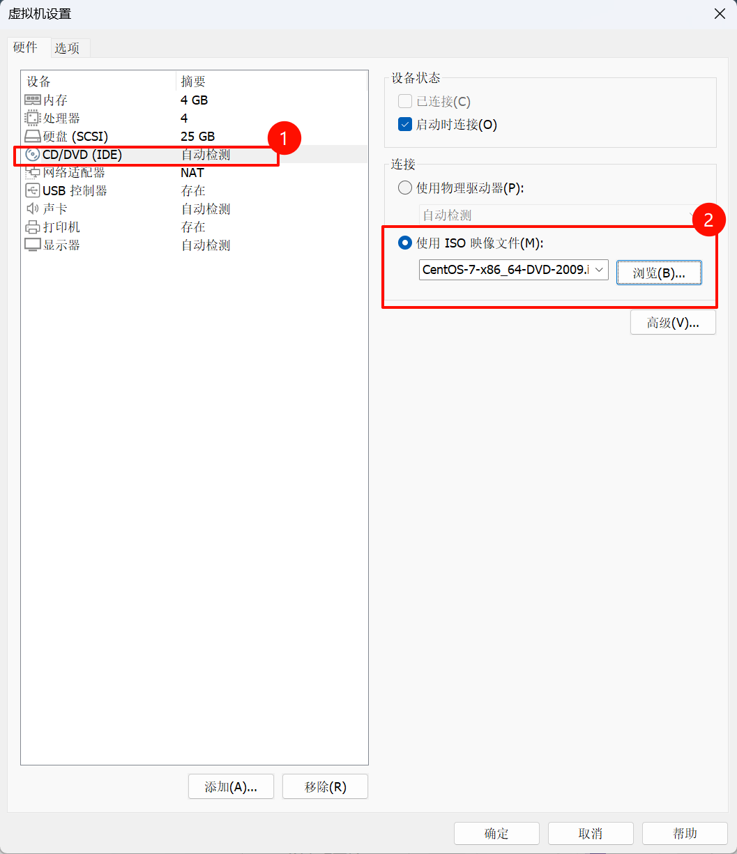 18、点击硬件中的CD/DVD设置,选择本地存储的centOS映像文件。然后点确定。