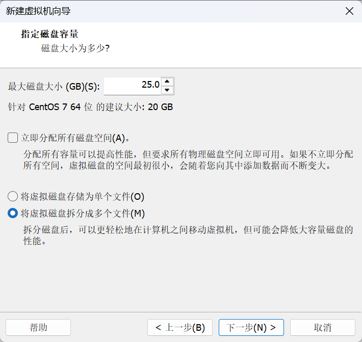 13、设置虚拟磁盘大小【根据需求设置大小】,并设置“将虚拟磁盘拆分为多个文件”。