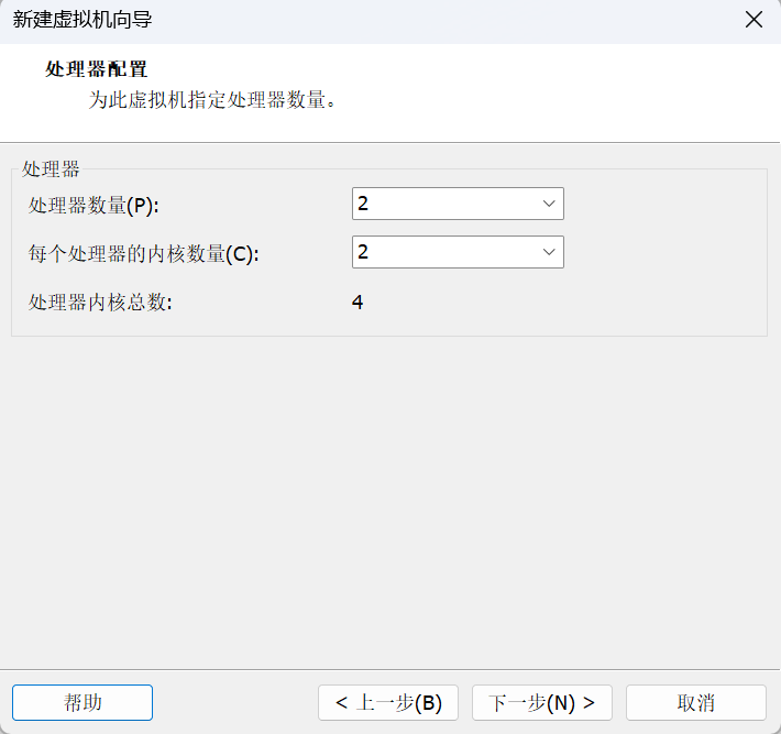 7、设置虚拟机的CPU数量,为了系统的健康,不要高于宿主机的一半,也不要过低。