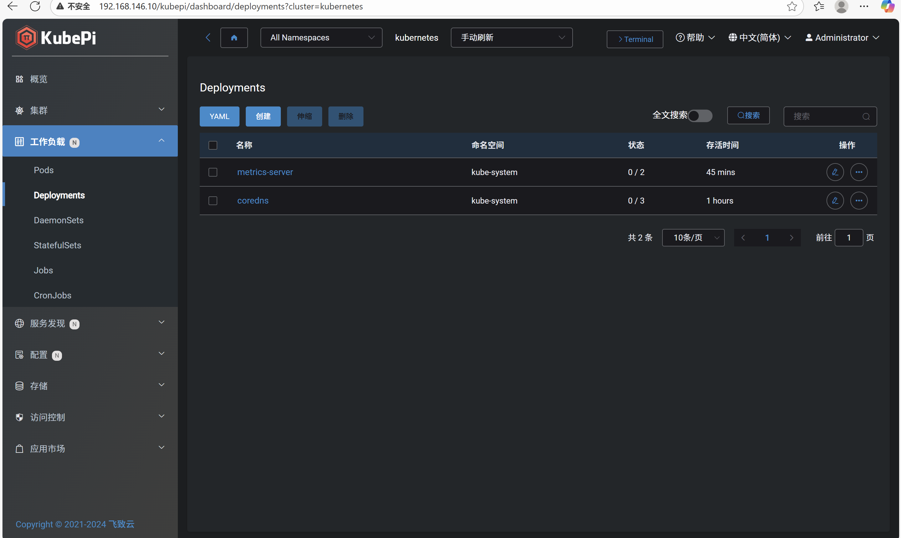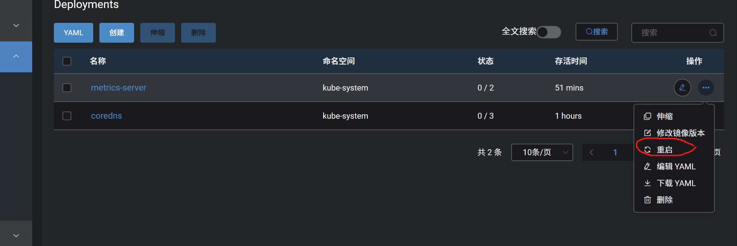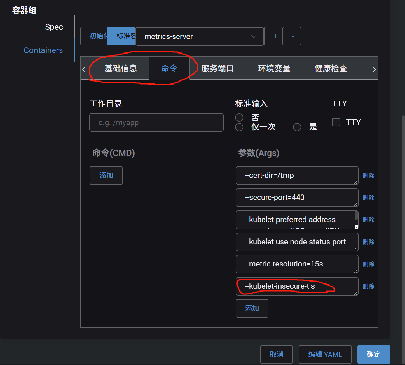 修改配置,点击工作负载,再点击Deployments,点击metrics-server操作里面的第一个按钮