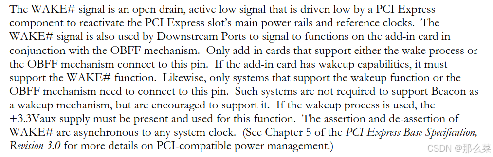 WAKE#信号的置位和解除置位与任何系统时钟均不同步。(更多关于PCI兼容电源管理的详细信息,请参阅《PCI Express基础规范3.0版》第5章。)