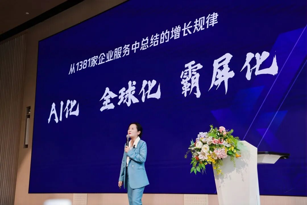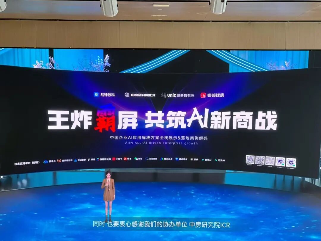 在热烈的掌声中,战神数科创始人冯心怡女士登台发表开场致辞《拥抱智能·向远而行》。她强调,AI正在重构商业逻辑与组织形态,企业必须主动拥抱智能技术,才能实现可持续增长。同时感谢了协办单位——中房研究院ICR、绿景白石洲、咚咚找房的大力支持,并呼吁所有参会者“以AI为引擎,共创产业新生态”。