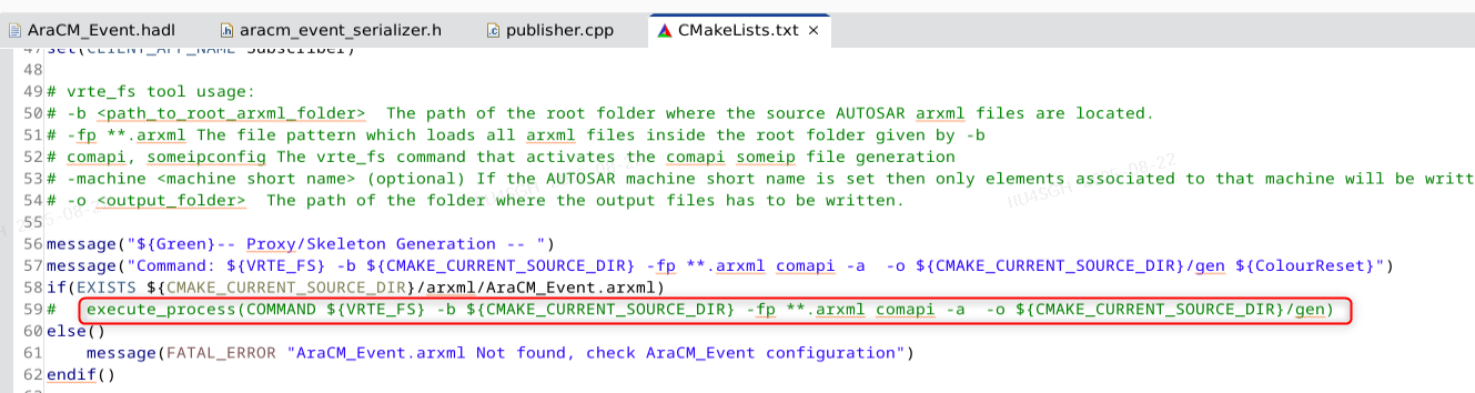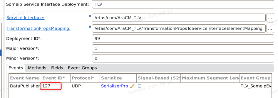 import AUTOSAR.StdTypes.stringpackage etas.com {interface AraCM_TLV namespace etas.com {event DataPublisher of DataMessagemethod DataIO (in message (tlvId:33) of string, out value(tlvId:44) of uint8_t)} // if tlv is configured, all members must have tlvids and the ids are unique struct DataMessage {DataArray(tlvId:11) of optional<array<uint8_t, 256>>DataString(tlvId:22) of optional<string>} /* The definition of Software Components in the Application Design including the provided and required ports categorized by the relevant ServiceInterfaces are now mandatory for the services definition. */ component Publisher_Component {provide PPort for AraCM_TLV}component Subscriber_Component {require RPort for AraCM_TLV}