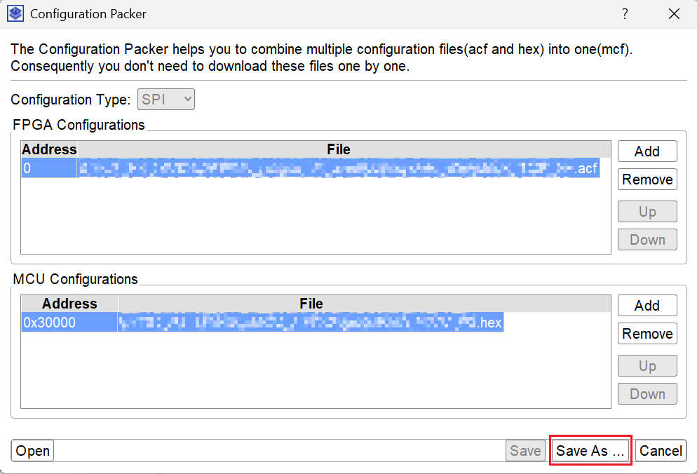 分别配置FPGA Configuarations、MCU Configuarations,通过点击Add可以选择需要合并的文件,点击Save As...,选择保存生成的*.mcf文件路径。