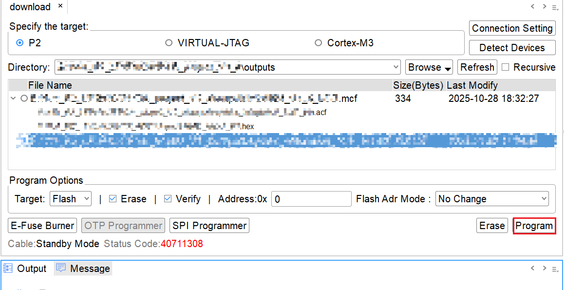 使用者在BOOT+APP开发模式下,需要先将ARM BOOT程序的*.hex与FPGA的程序打包为*.acf文件,在开发生成ARM APP的*.hex文件。分两步将*.acf烧录到FLASH 0地址开始的地址空间,将APP的*.hex烧录到FLASH 非0地址(需要根据*.acf大小合理划分地址,保证一个原则不能覆盖*.acf的数据区域,例如:0x300000)。