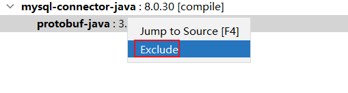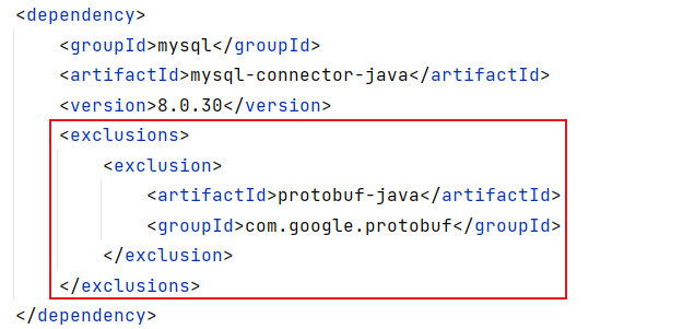 比如 引入 mysql 依赖时不需要 protobuf 依赖,可以使用这种方式排除依赖