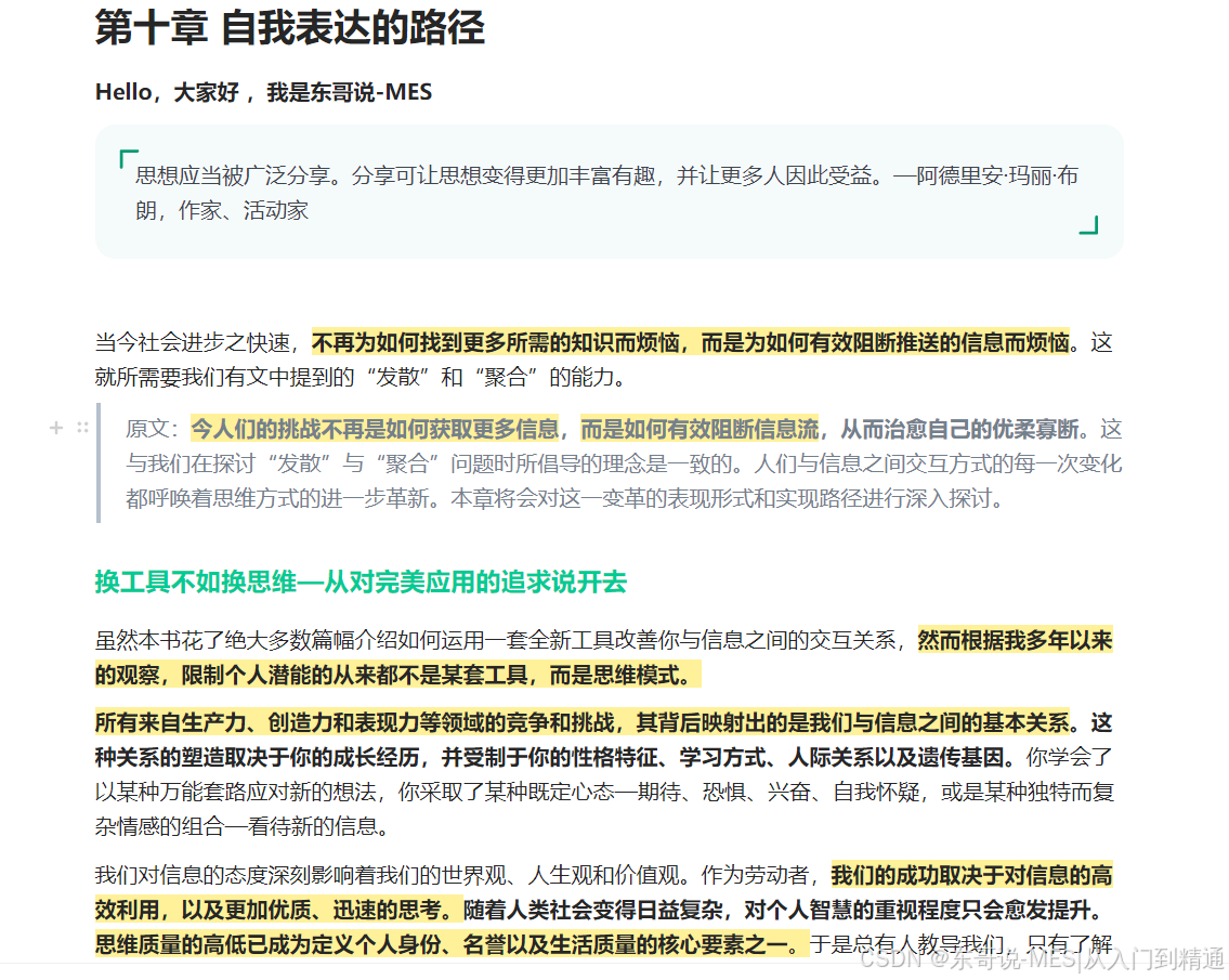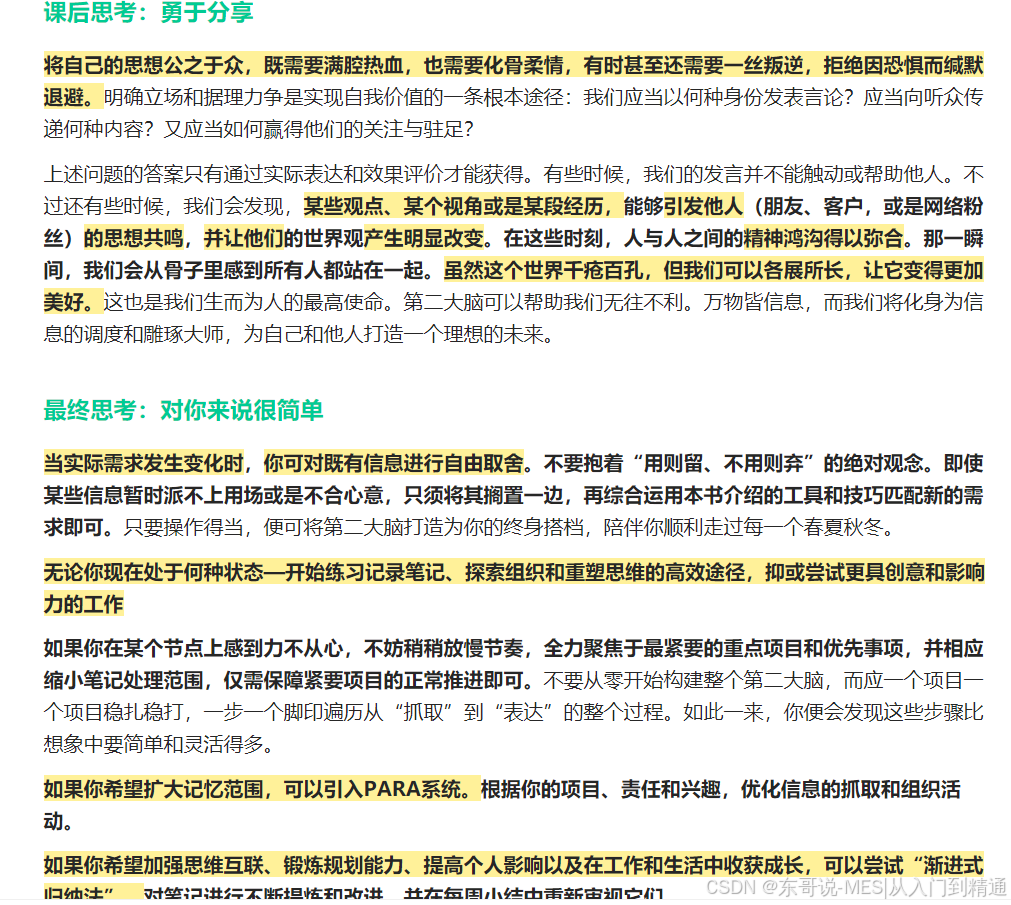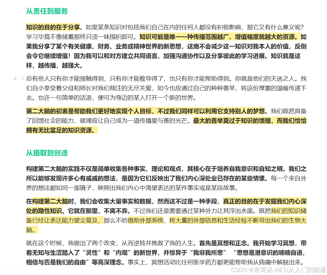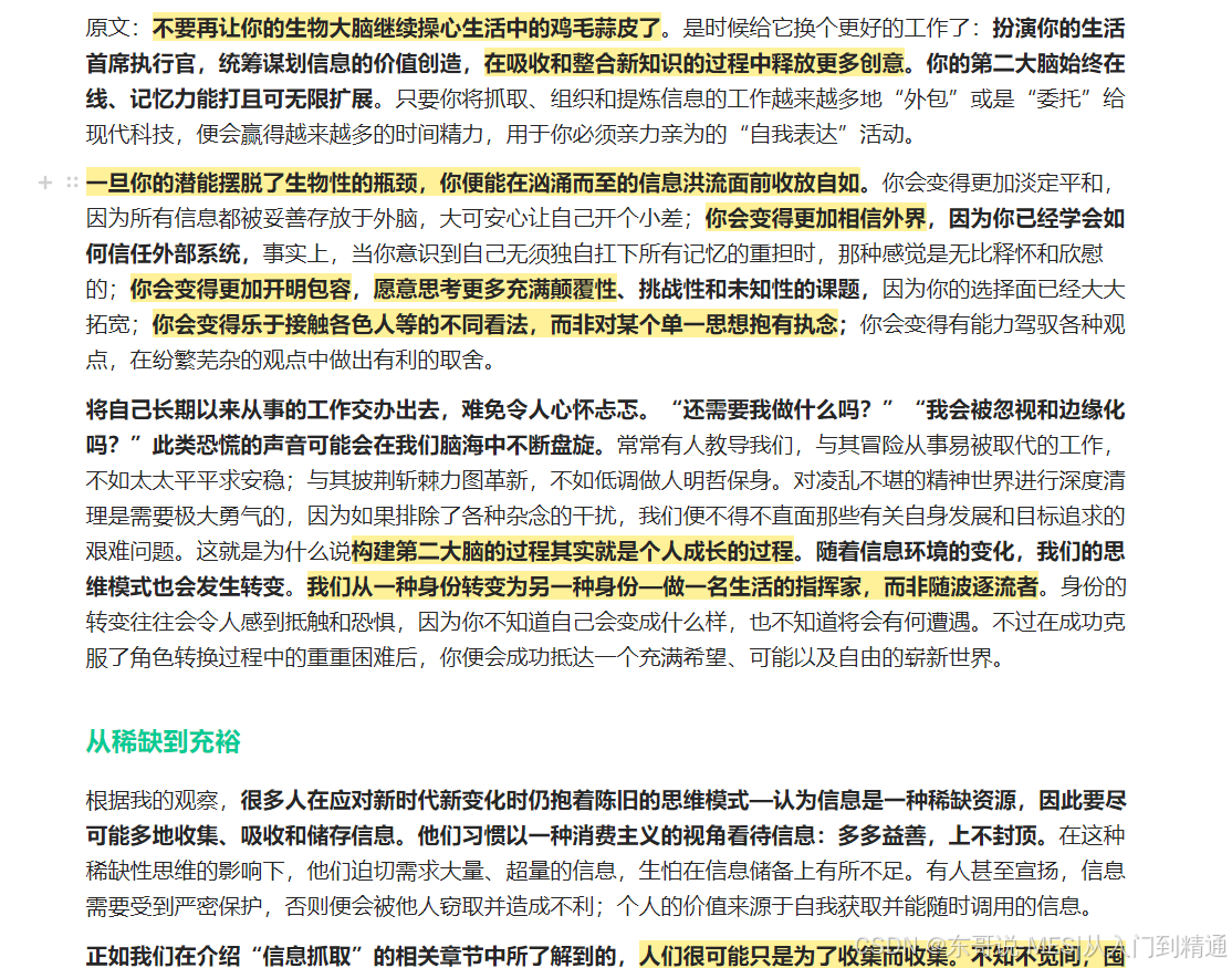 原文:不要再让你的生物大脑继续操心生活中的鸡毛蒜皮了。是时候给它换个更好的工作了:扮演你的生活首席执行官,统筹谋划信息的价值创造,在吸收和整合新知识的过程中释放更多创意。你的第二大脑始终在线、记忆力能打且可无限扩展。只要你将抓取、组织和提炼信息的工作越来越多地“外包”或是“委托”给现代科技,便会赢得越来越多的时间精力,用于你必须亲力亲为的“自我表达”活动。