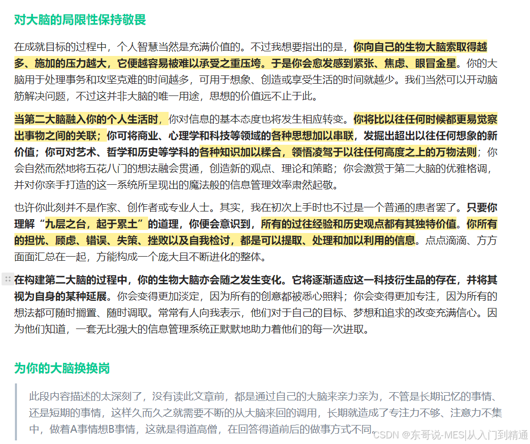 此段内容描述的太深刻了,没有读此文章前,都是通过自己的大脑来亲力亲为,不管是长期记忆的事情、还是短期的事情,这样久而久之就需要不断的从大脑来回的调用,长期就造成了专注力不够、注意力不集中,做着A事情想B事情,这就是得道高僧,在回答得道前后的做事方式不同。