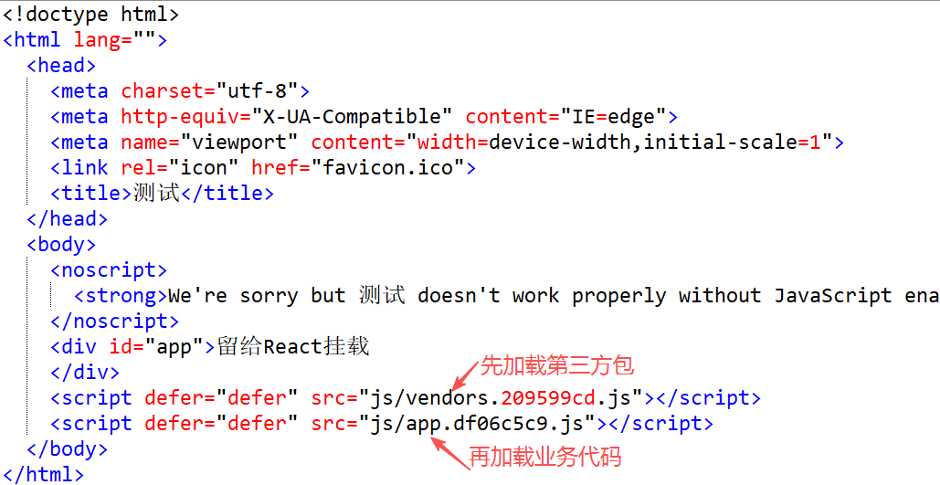 const { ProgressPlugin, ProvidePlugin } = require('webpack') // webpack自带插件module.exports = {entry: {// 把第三方库打包到vendors.js中,从业务代码中抽离出来,为了以后部署时做CDN优化vendors: ['react', 'react-dom/client'],// 可以给入口文件取个名字,给output使用app: {// 用import引入main.js作为入口文件import: path.resolve(__dirname, '../', 'src/main.js'),dependOn: 'vendors' // 用dependOn指定业务代码app依赖于vendors,先打包vendors,再打包app}},// 出口output: {// 自定义打包结果的输出目录,默认是dist目录,这里只能使用绝对路径path: path.resolve(__dirname, '../', 'dist'),// 指定打包结果的JS名称规范// filename: 'bundle.js' // 量词,一捆、一束filename: 'js/[name].[chunkhash:8].js',// 每次build打包时,都自动先删除dist中的旧文件clean: true},// 插件// 所有webpack插件都是class,用的时候需要newplugins: [// 用于把JS脚本和index.html自动注入合并new HtmlWebpackPlugin({template: path.resolve(__dirname, '../', 'public/index.html'),inject: 'body', // 把JS注入到body结束标签前面filename: 'index.html', // 指定打包成功后这个模板叫什么名字title: '测试'}),// 添加编译进度条new ProgressPlugin({handler(percentage, message, ...args) {console.log(percentage, message, ...args)}}),// 从node_modules中加载react包,将其放在全局变量React中,这样之后所有的文件模块都可以直接访问new ProvidePlugin({React: 'react'}),],// 在webpack眼中一切文件皆模块,webpack必须使用各种loaders来处理各种不同的模块文件module: {// 定义模块编译的规则和方式rules: [{test: /\.(js|jsx|ts|tsx)$/, // 检测模块以js结尾use: ['babel-loader'], // 使用babel编译器把ES6+的代码编译成ES5exclude: /node_modules/, // 排除node_modules目录下的第三方包文件}]}