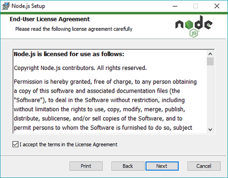 3) Node.js默认安装目录为 "C:\Program Files\nodejs\" , 建议安装到非系统盘,并点击 Next 按钮: