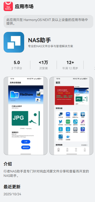 为了解决这些问题,推荐使用 「NAS助手」 —— 一款专为 纯血鸿蒙系统 打造的轻量级 NAS 管理与分享工具。 它不仅填补了鸿蒙生态下 NAS 文件分享的空白,也进一步增强了 NAS 的实用性与娱乐性。