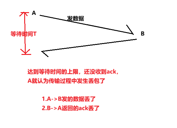 - 假设当前A->B发送数据包,丢包的超时时间阈值为T