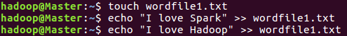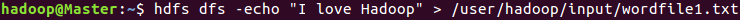 hdfs dfs -echo "I love Hadoop" > /user/hadoop/input/wordfile1.txt