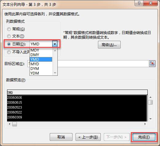 第六步:在【文本分列向导-第3步】对话框中,左键单击选中【列数据格式】中的【日期(D)】,左键单击【日期(D)】后的小箭头,可以选择日期排列顺序,左键单击【完成(F)】。