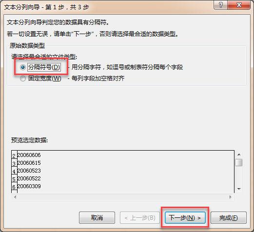 第四步:在【文本分列向导-第1步】对话框中,左键单击选中【请选择最合适的文件类型】中的【分隔符号(D)】,然后左键单击【下一步(N)】按钮。
