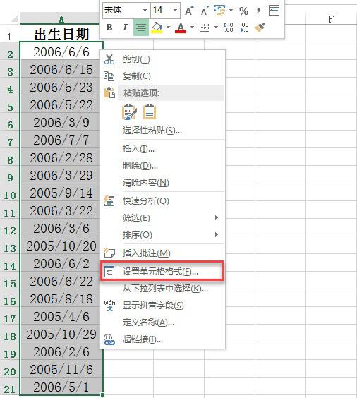 第八步:如果想更换日期格式的显示类型,先选中需要更改的单元格,右键单击后弹出菜单,左键单击菜单中的【设置单元格格式(F)】。