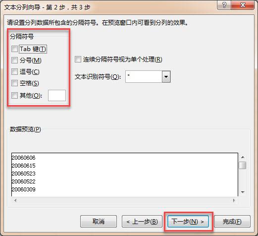 第五步:在【文本分列向导-第2步】对话框中,左键单击去掉【分隔符号】中方格前所有对勾,然后左键单击【下一步(N)】按钮。
