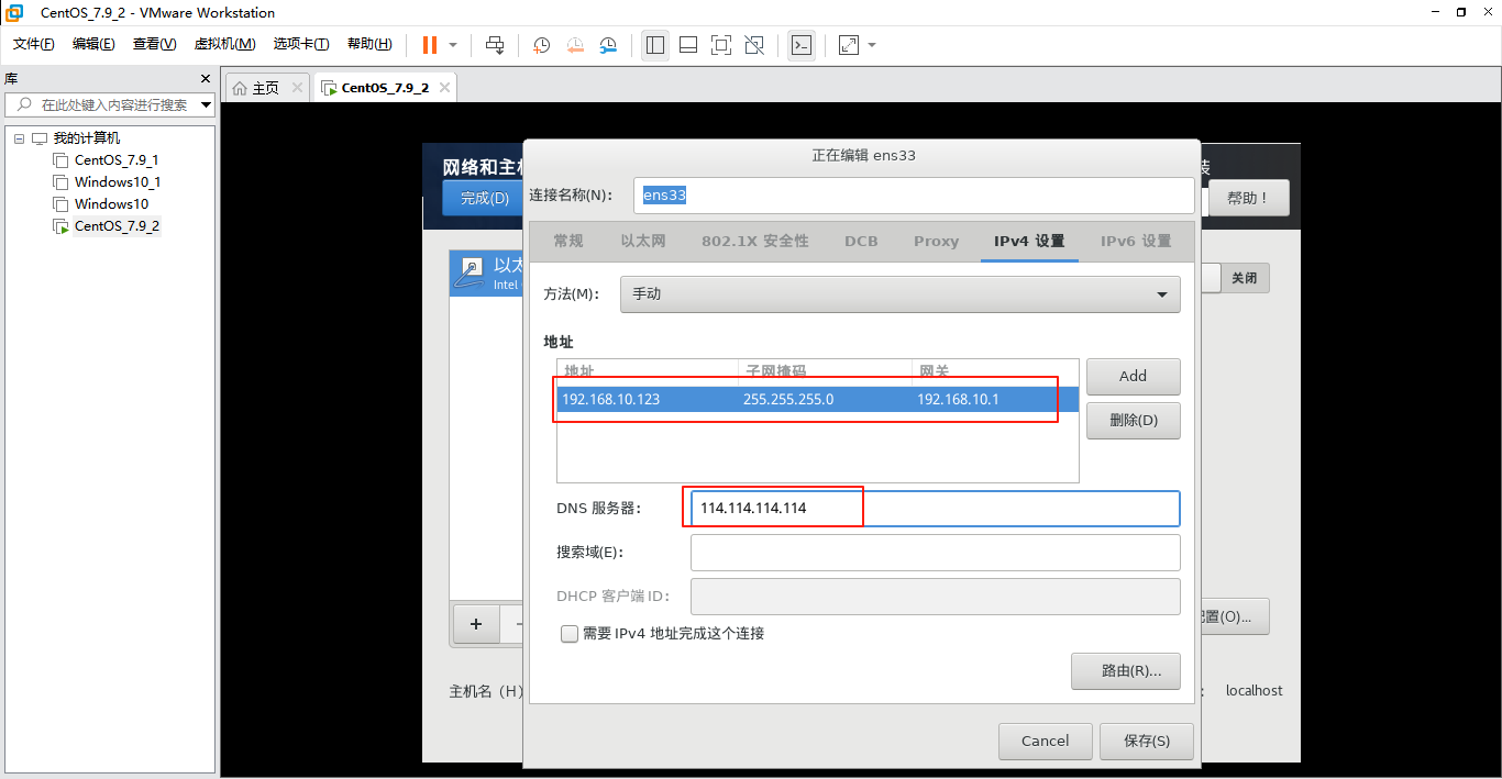 刚刚看到的网段是192.168.10.0,所以ip地址需要符合这个网段。DNS服务器设置为114.114.114.114