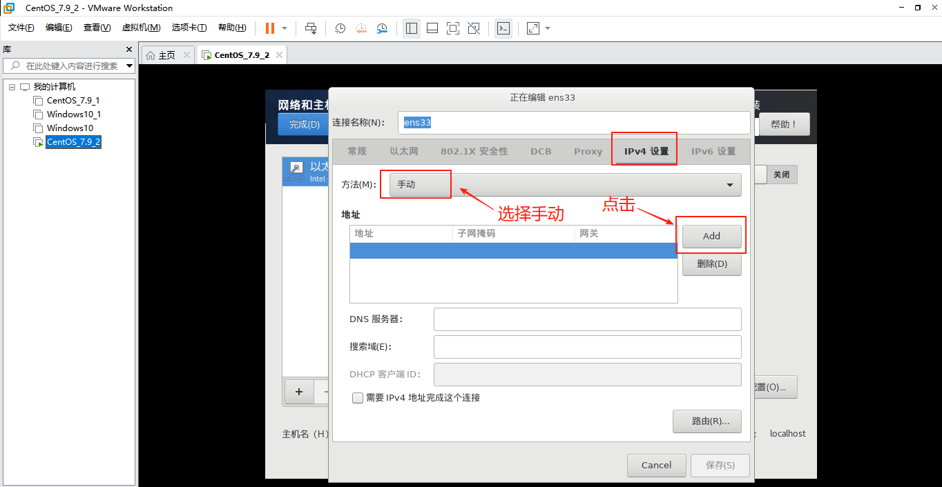 点击Ipv4设置,修改成手动,点击Add