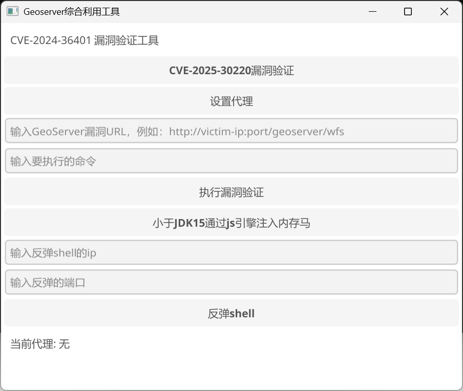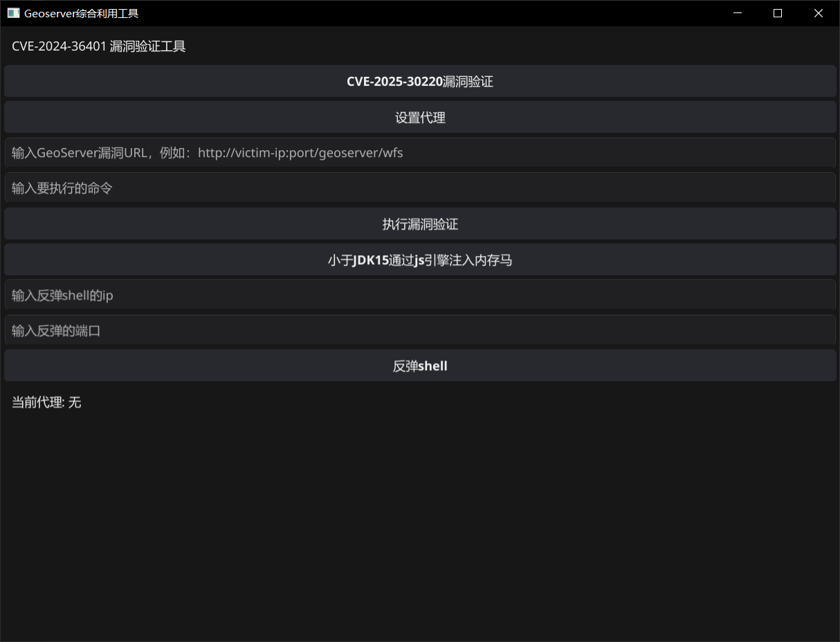 工具介绍 Geoserver漏洞图形化利用工具,功能包含命令执行、反弹shell、低版本JDK注入内存马、XXE漏洞利用。 更新 添加对CVE-2025-30220的漏洞检测和利用 工具下载 https://github.com/netuseradministrator/Geoserver_gui_exp