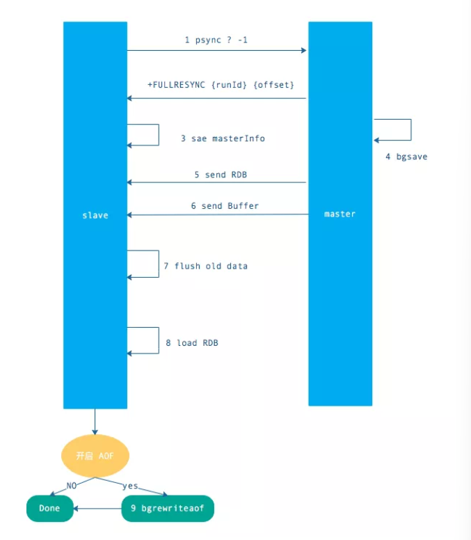 如果回复+FULLRESYNC {runID} {offset},从节点开始全量复制。
