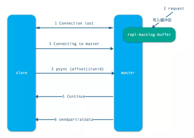 连接恢复后,从节点会将之前保存的自己已复制的偏移量和运行ID用psync命令发送给主节点,要求进行部分复制操作。