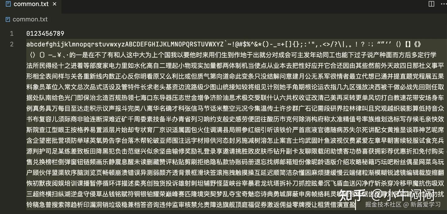 该工具还会增加一份日常维护的常用字符文件,以兜底一些无法覆盖到的场景,比如某些字符来自于后端配置,如下是一份 1500 左右的常用字符: