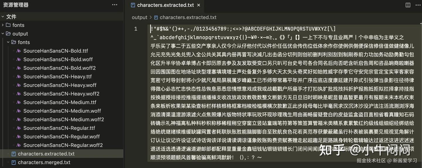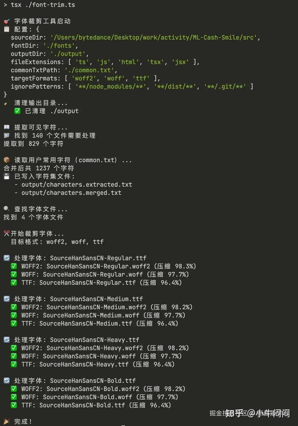 async function fontTrim() {const charsOutDir = config.outputDir;const fontsOutDir = path.join(config.outputDir, "fonts");// 清理并创建输出目录await fs.rm(charsOutDir, { recursive: true, force: true }).catch(() => {});await ensureDir(charsOutDir);await ensureDir(fontsOutDir);// 全量提取可见字符/剔除无效字符const extractedSet = await extractVisibleCharsFromDirectory(config.sourceDir,config.fileExtensions,config.ignorePatterns);const extractedStr = toSortedString(extractedSet);// 合并用户常用字符const userSet = await readUserCommonChars(config.commonTxtPath);const merged = new Set<string>([...extractedSet, ...userSet]);const mergedStr = toSortedString(merged);// 保存字符集文件const extractedOut = path.join(charsOutDir, "characters.extracted.txt");// 提取到的字符const mergedOut = path.join(charsOutDir, "characters.merged.txt");// 与 common.txt合并后的字符await writeText(extractedOut, extractedStr);await writeText(mergedOut, mergedStr);// 查找字体文件const fontFiles = await findFontFiles(config.fontDir, config.ignorePatterns);// 裁剪并输出字体文件await subsetFonts(fontFiles, mergedStr, fontsOutDir, config.targetFormats);