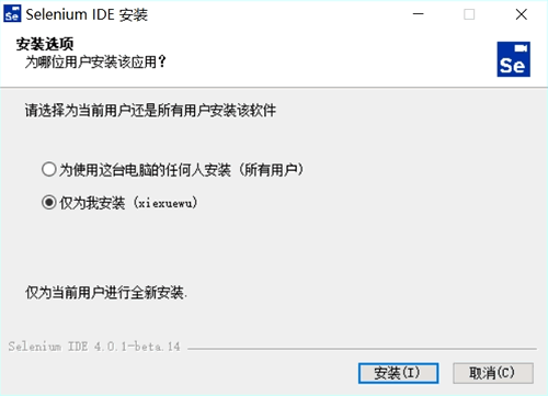 1) 以 Windows 为例,从网盘中下载得到 Selenium-IDE-Setup-4.0.1-beta.14.exe 安装包,双击启动安装: