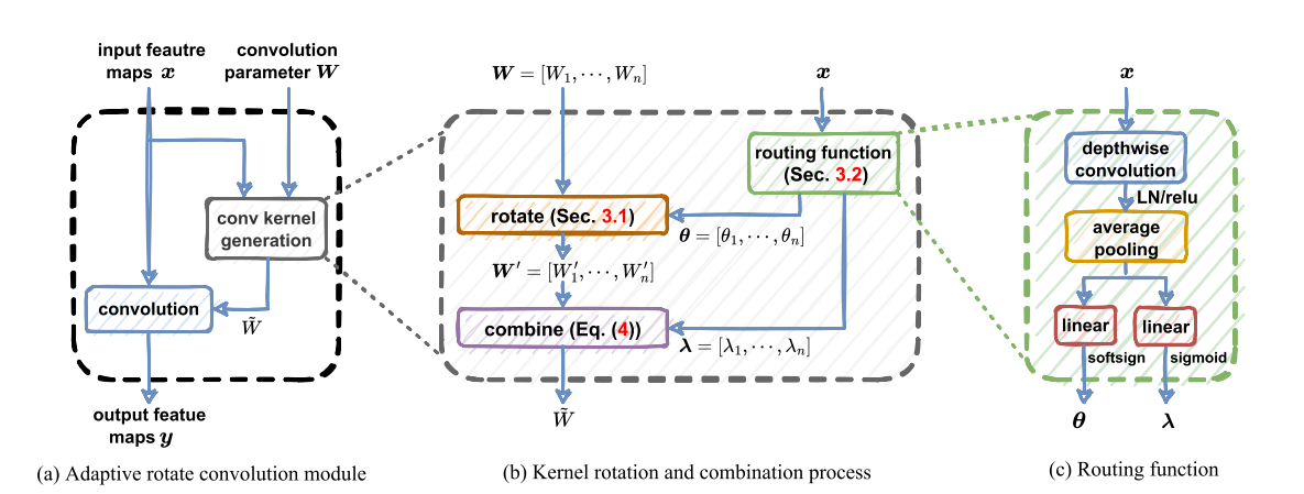 路由函数:根据输入自适应的产生旋转角度和以及对应的组合权重;整体结构如下图的c表示。