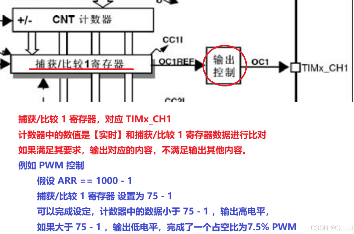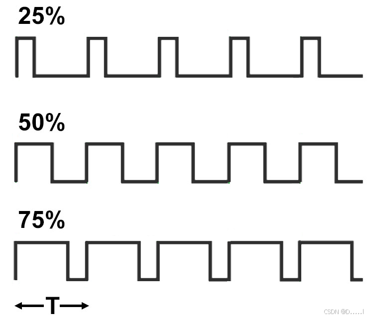 - 占空比:一个 PWM 周期内对应的高电平时间/整个 PWM 周期时间。