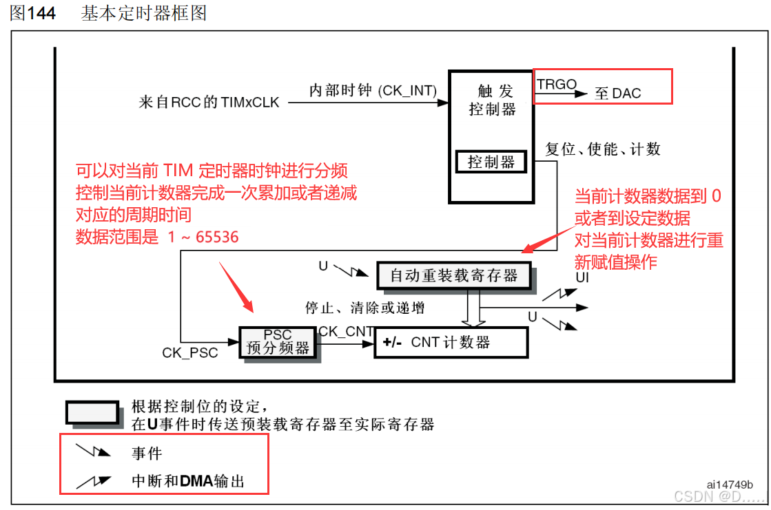 - 在更新事件(计数器溢出)时产生中断/DMA请求