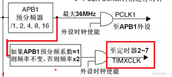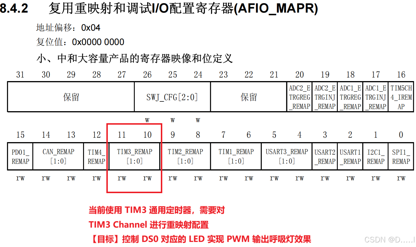 {/*1. 时钟使能1.1 TIM3 使能1.2 AFIO 使能,因为需要控制 TIM3_CH2 通道的重映射操作需要 AFIO 进行配合1.3 PB5 使能*/RCC->APB2ENR |= (RCC_APB2ENR_AFIOEN | RCC_APB2ENR_IOPBEN);RCC->APB1ENR |= RCC_APB1ENR_TIM3EN;/*【关闭当前定时器】防止之前存在定时器任务无法修改 PSC 和 ARR 数据*/TIM3->CR1 = 0;/*2. PB5 设置工作模式为 GPIO 复用推挽输出模式,速度为 50 MHz【复用推挽输出模式】因为当前 GPIO 的输出模式收到外设影响同时需要满足可以提供高低电平的模式,选择复用推挽输出模式*/GPIOB->CRL &= ~(0x0F << 20);GPIOB->CRL |= (0x0B << 20);/*3. AFIO IO复用功能开启,同时设置 TIM3_CH2 重映像需要设置 TIM3 部分重映射,设置完成 CH2 ==> PB5 引脚对应 DS0 LED 灯*/AFIO->MAPR &= ~(0x03 << 10);AFIO->MAPR |= 0x02 << 10;/*4. 定时器基础功能控制PSC 预分配倍数ARR 自动重装载寄存器*/TIM3->PSC = psc - 1;TIM3->ARR = arr - 1;/*5. TIM3_CH2 配置为对外输出,要求1. 对应输出模式 PWM12. 随时可以修改 CCR2 数据内容*/TIM3->CCMR1 &= ~(0xFF << 8);TIM3->CCMR1 |= (0x64 << 8);/*6. 当前通过 PWM 控制 DS0 LED对应计数器是向下规则CNT > CCR2 输出低电平,文档中对应 无效电平CNT < CCR2 输出高电平,文档中对应 有效电平设置有效电平为高电平*/TIM3->CCER &= ~(0x03 << 4);TIM3->CCER |= (0x01 << 4);/*7. 开启 TIM3 定时器*/TIM3->CR1 |= 0x01;