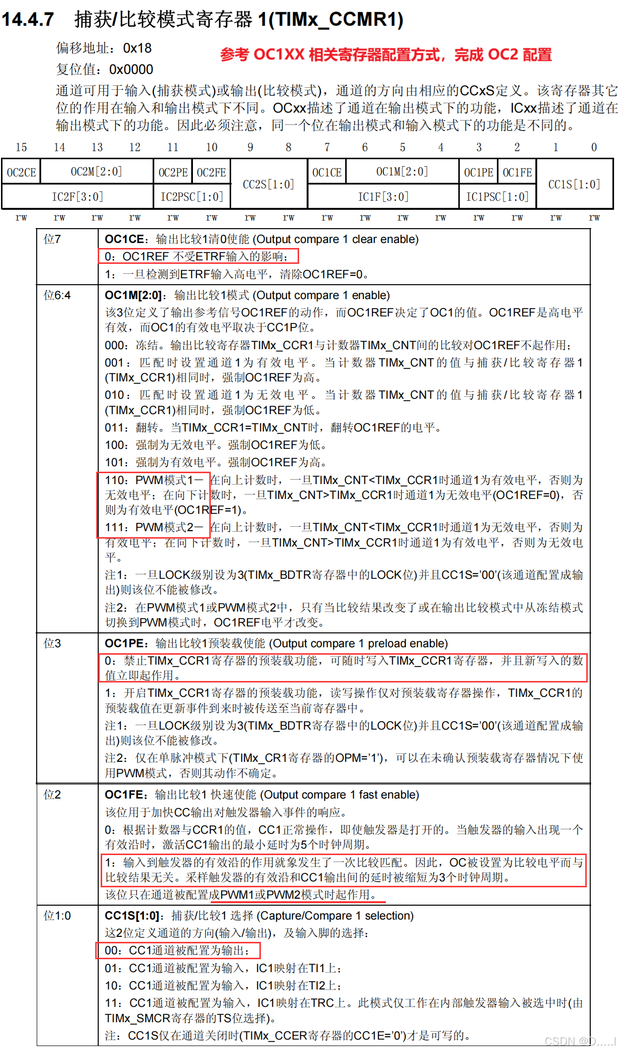 TIM2_CH4 端口选择输出,对应的输出模式选择 PWM1 或者 PMW2 工作模式。