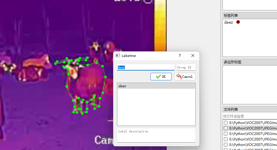 - 将目标框选为一个闭合多边形,输入(选择)deer标签