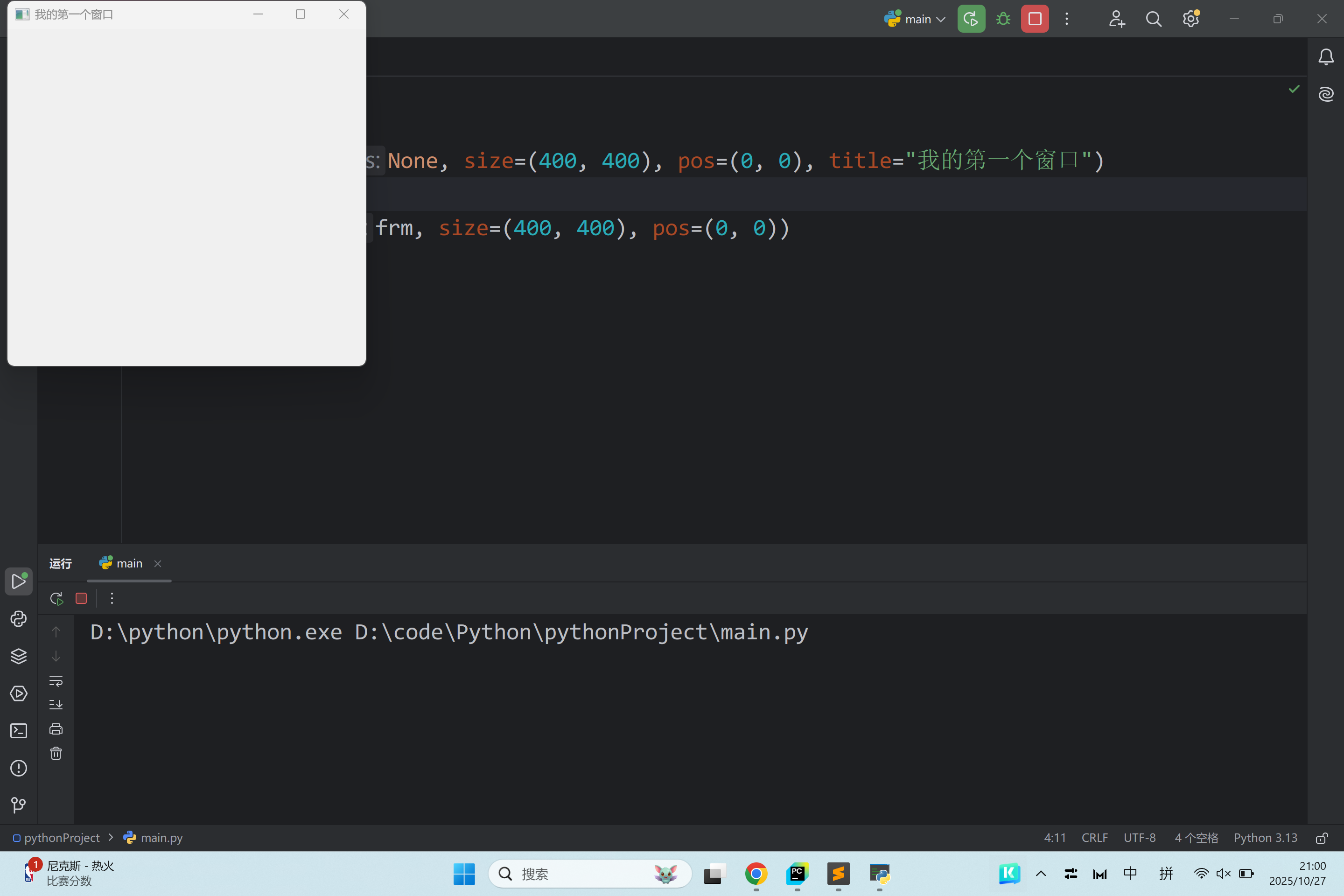 frm = wx.Frame(None, size=(400, 400), pos=(0, 0), title="我的第一个窗口")