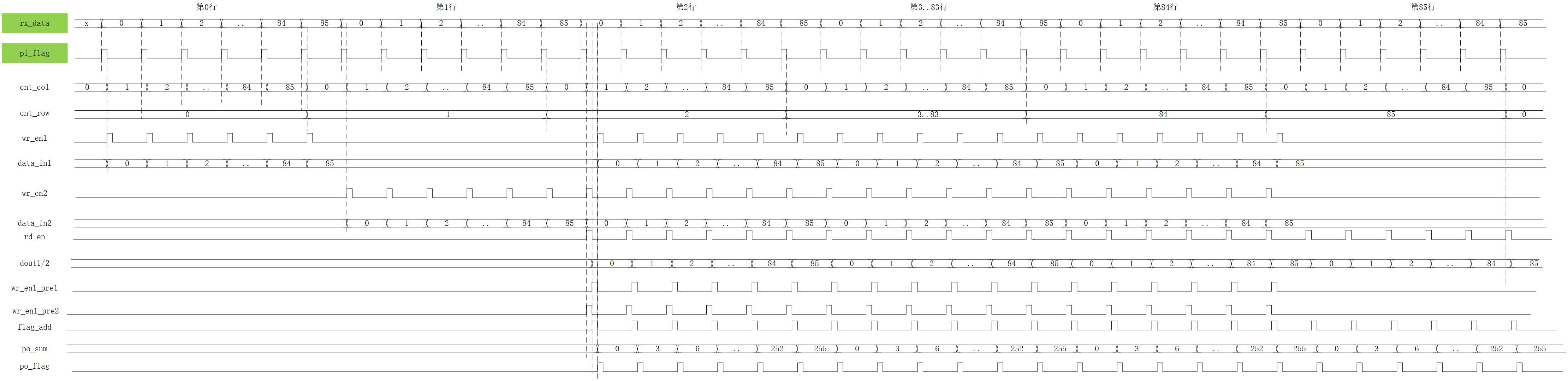 c、第0,1,2行加完后,需要把第1,2,3行数据相加,这时第0,1,2行的数据已经不在了所以需要在相加的时候把后面两行(第1,2行)数据存到fifo里面,即相加的同时需要将fifo2的数据存入fifo1,pidata的数据存入fifo1。