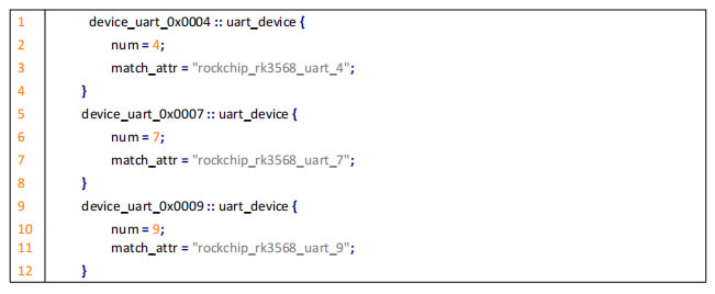 修改 vendor/hihope/rk3568/hdf_config/khdf/platform/rk3568_uart_config.hcs 文件,添加如 下内容,如下所示: