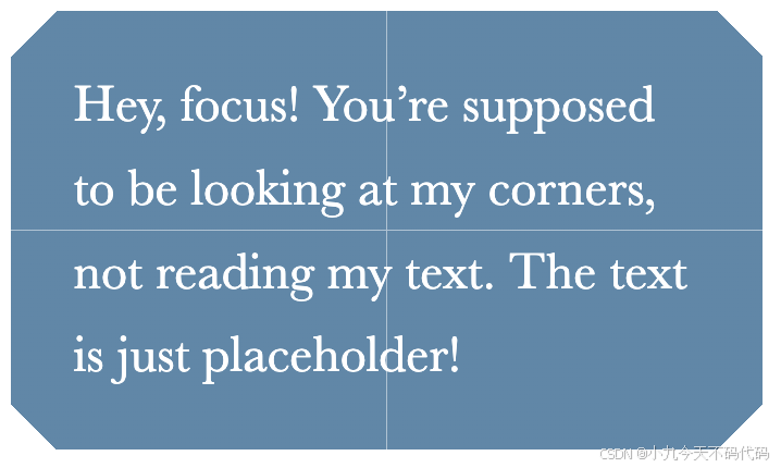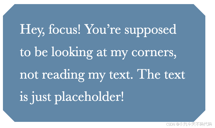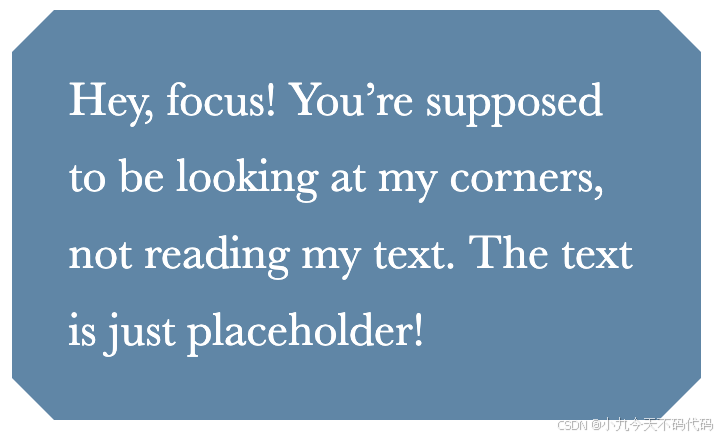.clip-shape {background: #58a;-webkit-clip-path: polygon(20px 0, calc(100% - 20px) 0, 100% 20px, 100% calc(100% - 20px),calc(100% - 20px) 100%, 20px 100%, 0 calc(100% - 20px), 0 20px);clip-path: polygon(20px 0, calc(100% - 20px) 0, 100% 20px, 100% calc(100% - 20px),calc(100% - 20px) 100%, 20px 100%, 0 calc(100% - 20px), 0 20px);padding: 1em 1.2em;color: #fff;font: 150%/1.6 Baskerville, Palatino, serif;max-width: 12em;